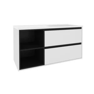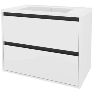 Мінімалістичний дизайн поєднується з максимальною функціональністю. Геометричні форми та виразні акценти створюють відчуття простору та світла, формуючи елегантне та гармонійне середовище, де кожен елемент, від підвісної тумби до стрункого пеналу, дихає свободою.