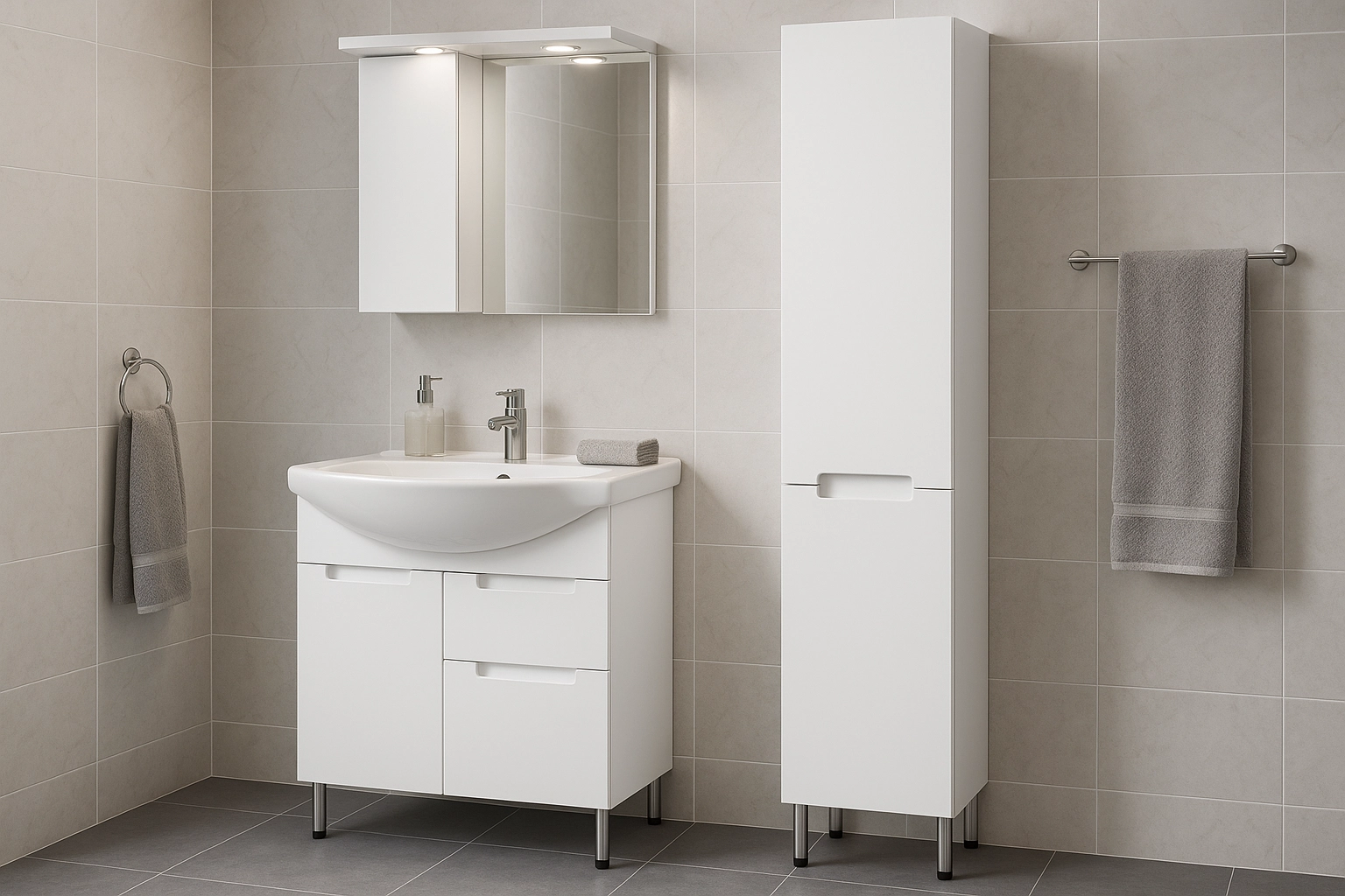 функціональні та доступні рішення для облаштування ванної кімнати. Прості форми, базовий білий колір та різноманітність елементів – від тумб з умивальниками до шаф і пеналів – дозволяють легко створити зручний та охайний простір, що відповідає вашим щоденним потребам